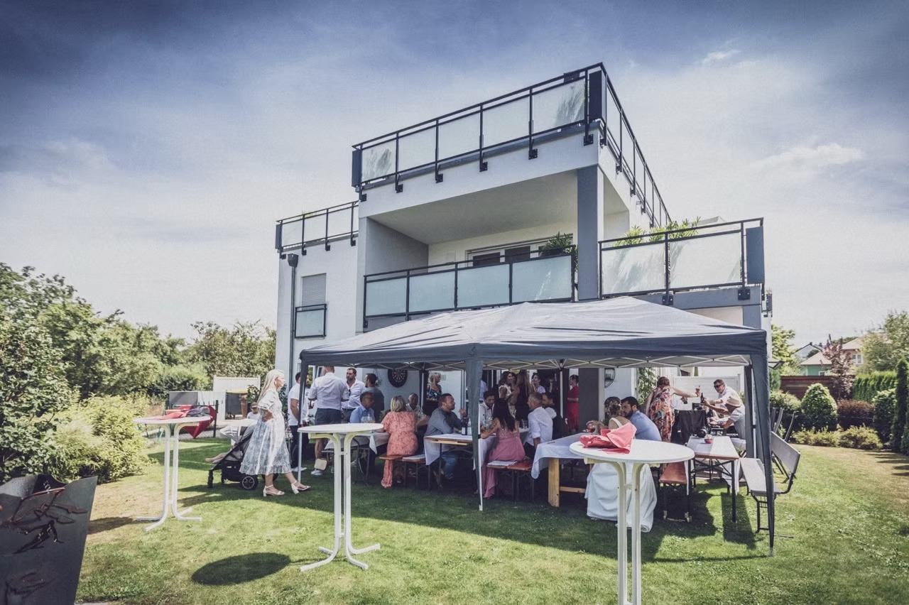 Nach der Trauung ging es erst einmal nach Hause – zu Anika & Jo, wo die beiden mit ihren Liebsten ein gemütliches Weißwurst-Essen veranstalteten. Eine schöne Gelegenheit für Familie und Freunde, in entspannter Atmosphäre zusammenzukommen, bevor es später zur Feierlocation weiterging.