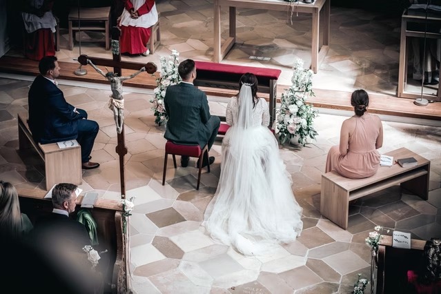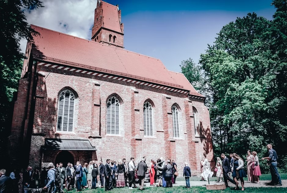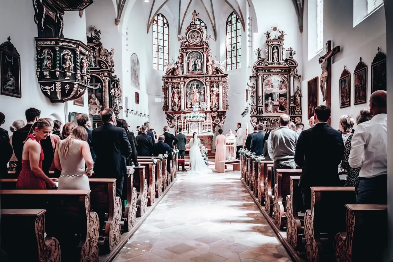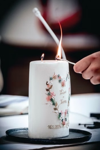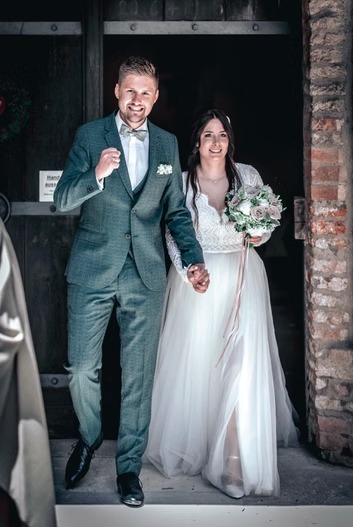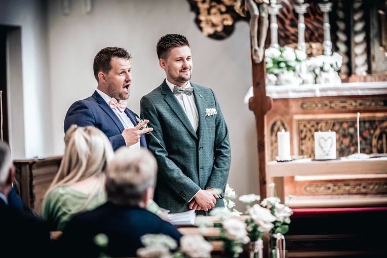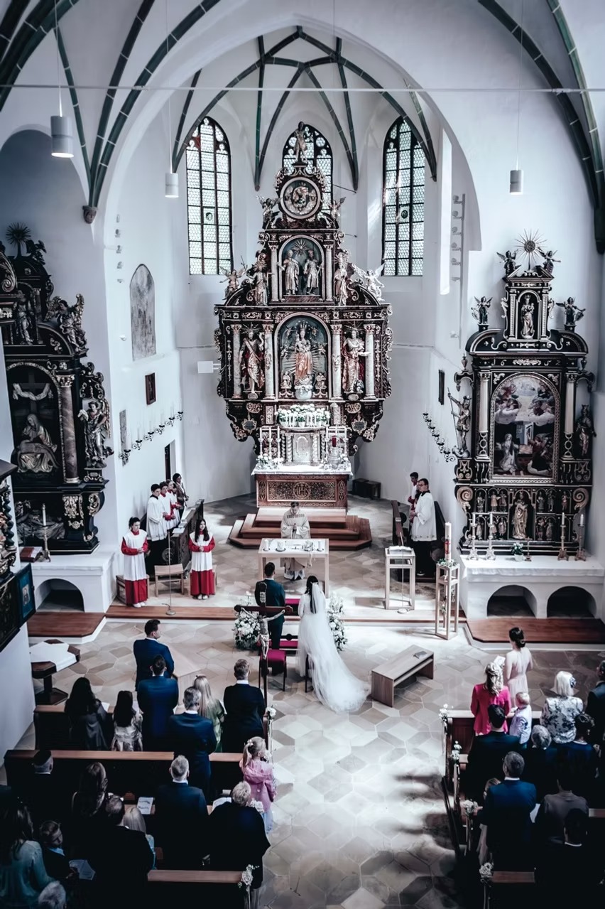 Der Tag begann in einer eindrucksvollen Kulisse: Maria vom Siege in Oberwittelsbach – eine Kirche mit beeindruckender Geschichte. Das altehrwürdige Gemäuer, die kunstvollen Verzierungen und das warme Licht machten die Zeremonie besonders atmosphärisch. Als Lisa, in ihrem traumhaften Kleid, langsam zum Altar schritt, konnte man die Emotionen in den Gesichtern der Gäste ablesen. Tom wartete vorne, sichtlich bewegt, und als sie sich das Ja-Wort gaben, war es ein Gänsehautmoment pur.